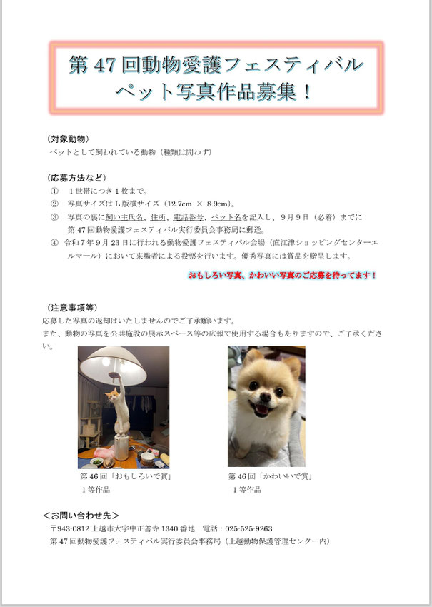 令和7年9月23日(祝)、第47回 動物愛護フェスティバル in上越 のフォトコンテストのペット写真を募集しています。